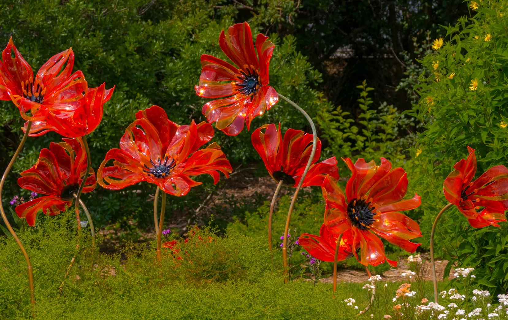“Crimson Bloom” is a celebration of nature’s boldest hues, captured in luminous glass. These oversized red blossoms burst forth from the garden with radiant energy, their translucent petals glowing in sunlight and shimmering in shade. Each flower is meticulously crafted to evoke the delicate texture of real blooms while standing resilient against the elements. Planted among greenery, they transform any outdoor space into a living gallery of color and form.