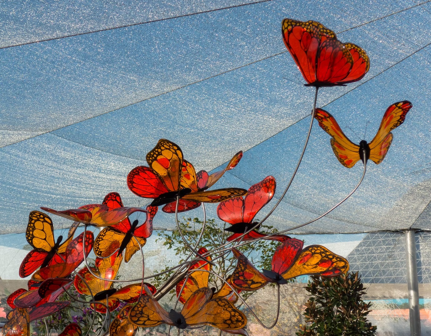 Ignite your space with movement and color. “Flight of Fire” is a breathtaking suspended sculpture featuring a swarm of fiery orange and red butterflies, each delicately crafted to evoke the energy of nature in motion. Suspended beneath a mesh canopy, these glass butterflies appear to soar mid-air, casting dynamic shadows and reflections that shift with the light. Perfect for garden installations, atriums, or large indoor spaces, this piece transforms any environment into a living canvas of flight and flame.
