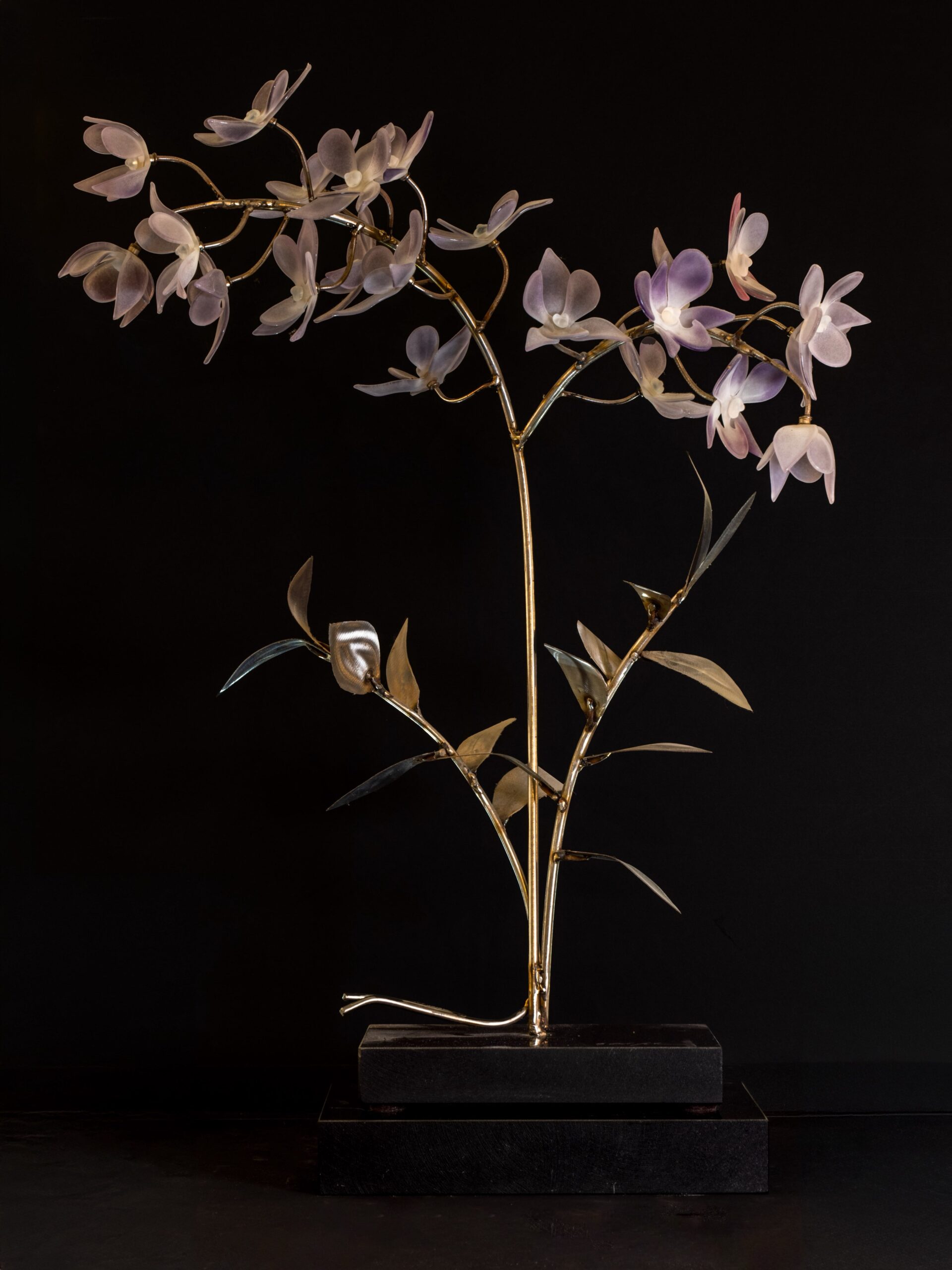 Whispering Orchid is a celebration of quiet elegance — a cascade of hand-fired glass blossoms, each petal kissed with soft lavender hues. Supported by a sculpted metal stem, this piece feels as though it is still swaying in a gentle breeze, frozen in time.